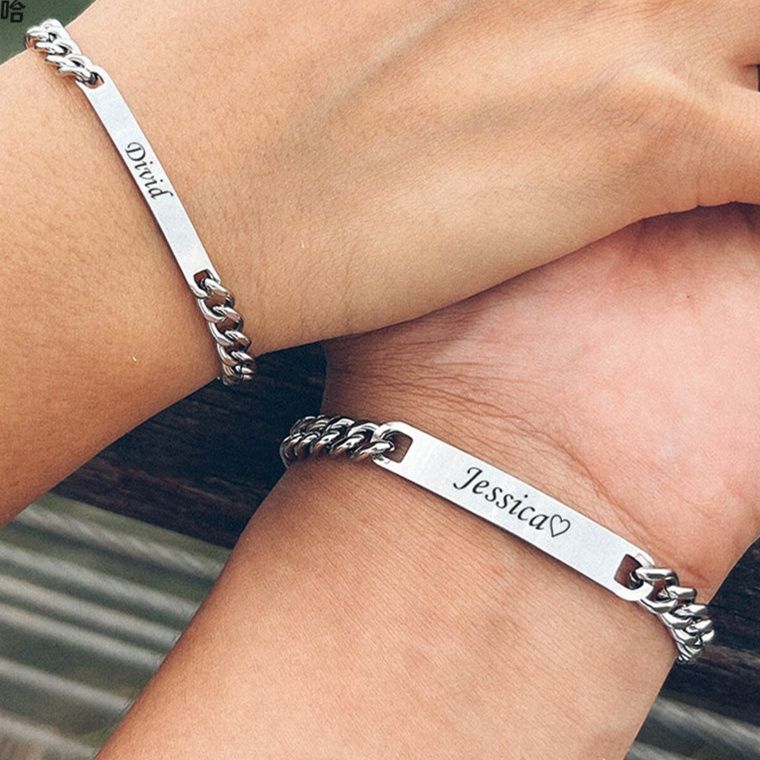 永遠の絆を刻むプレートが特徴的な喜平チェーンのペアブレスレットは、女性へのプレゼントとして高級感があります。