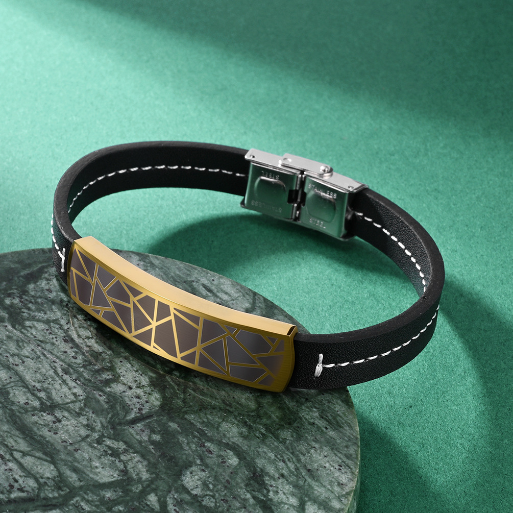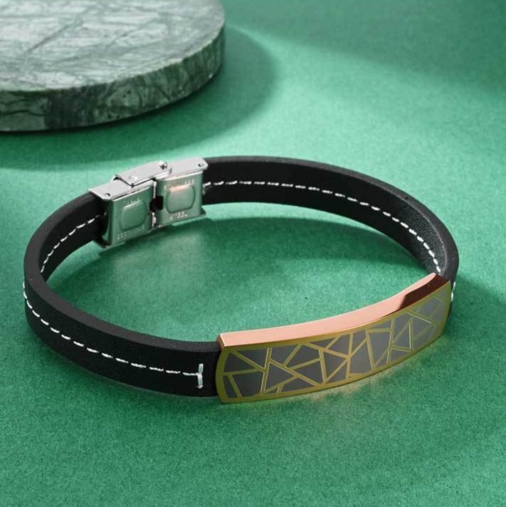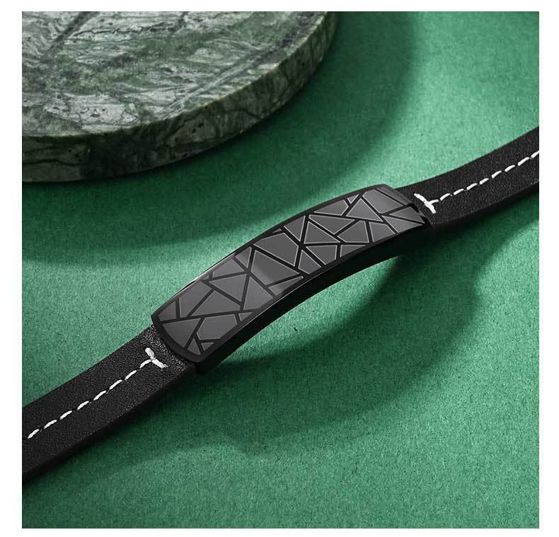 高級感あふれる幾何学模様のプレートが特徴的なペアブレスレットです。ステンレス製のプレートに繊細な三角形の模様を施し、革紐との組み合わせで上品な雰囲気を演出します。