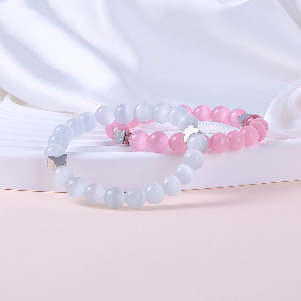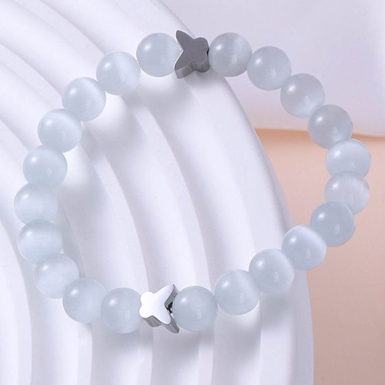 天然の猫眼石を丁寧に連ねた数珠型のデザインに、可愛らしい蝶々のチャームがアクセントとして施されています。
