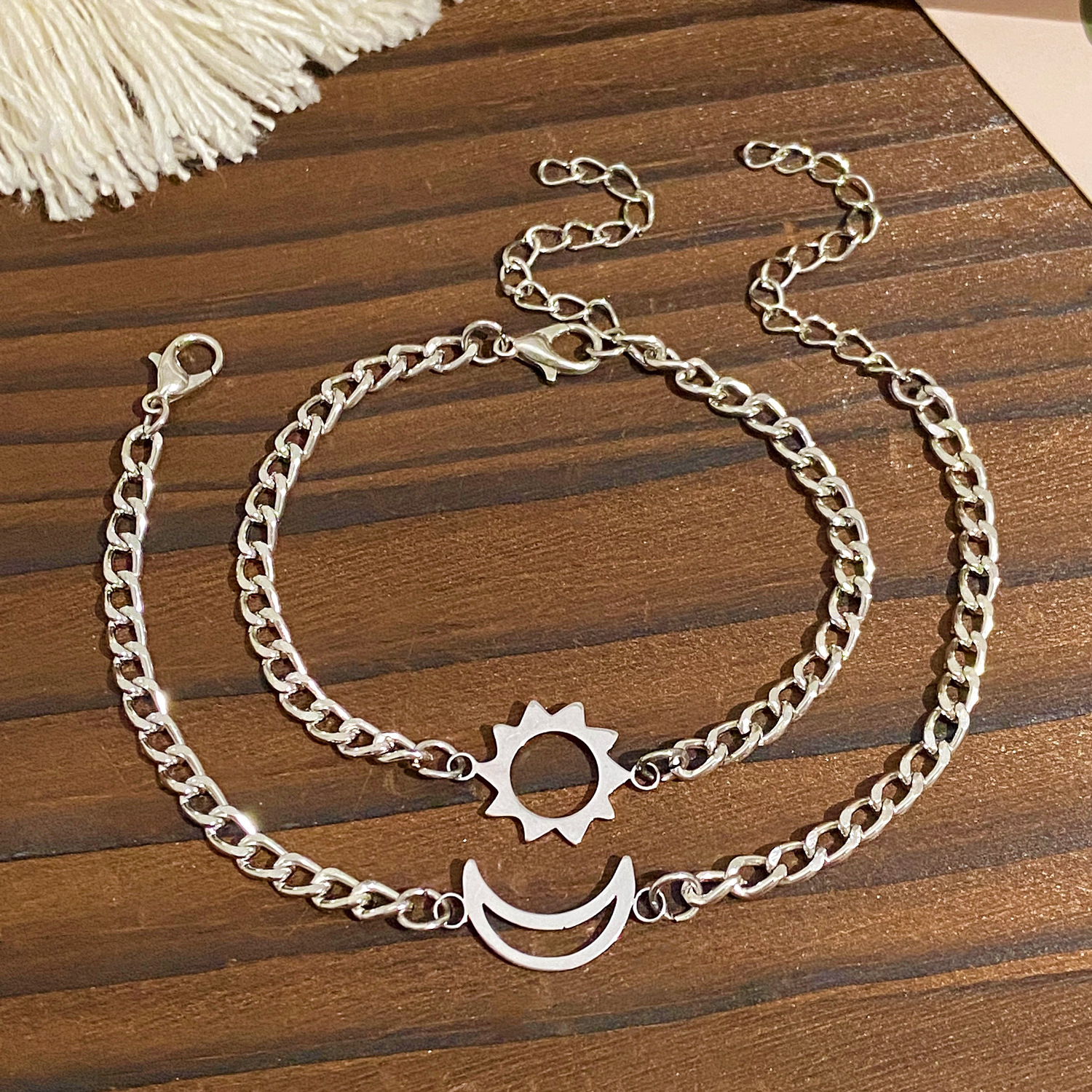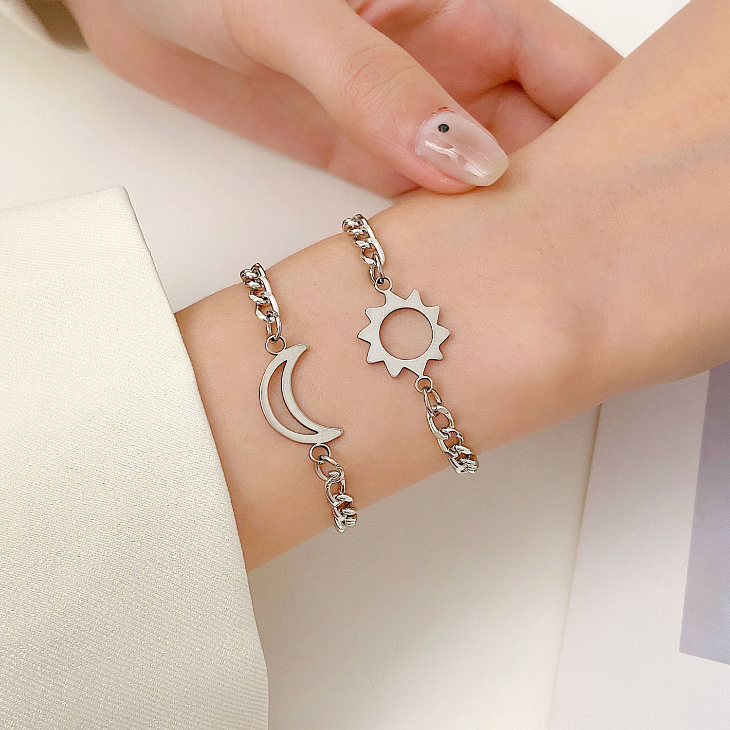 異なるデザインのチェーンブレスレットを組み合わせることでトレンド感のある仕上がりに。