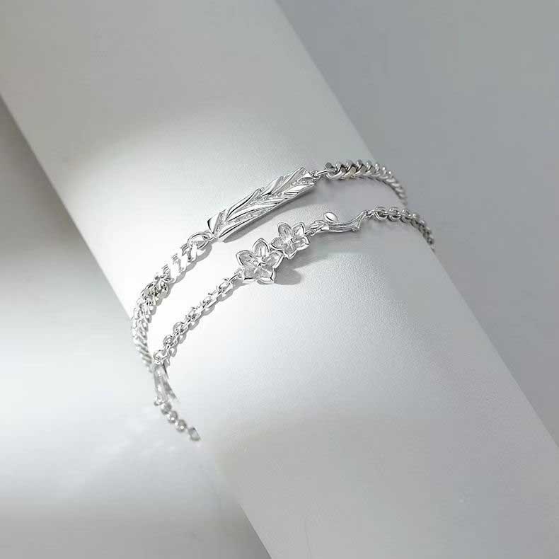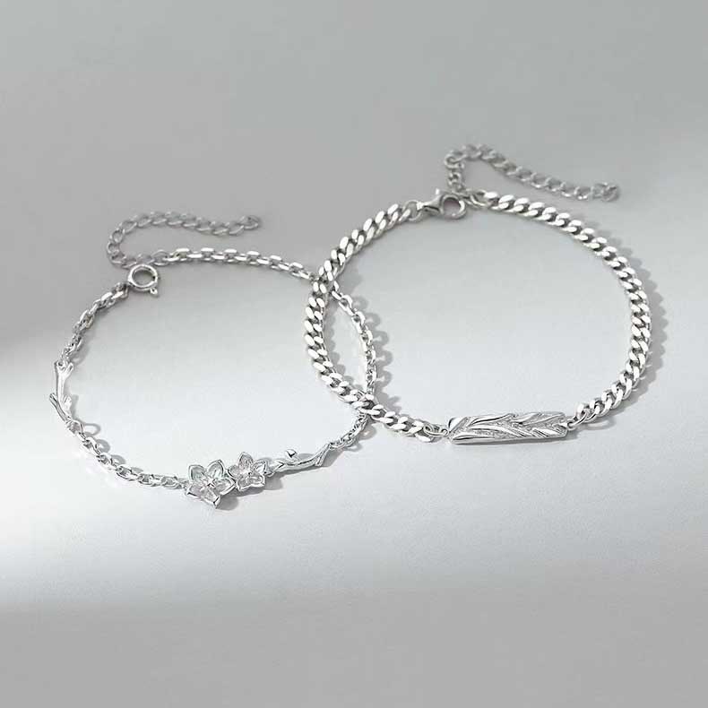 繊細な組み紐デザインと華奢なチェーンが美しく調和したシルバーのペアブレスレットです。