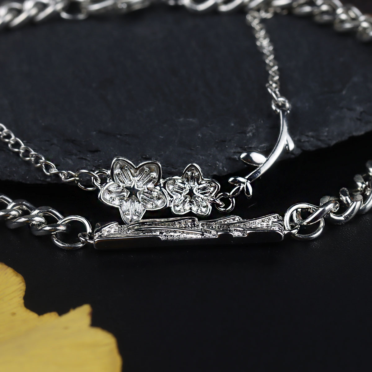 華奢なチェーンと存在感のあるチェーンの組み合わせで、重ね付けスタイルを楽しめる洗練されたデザインです。
