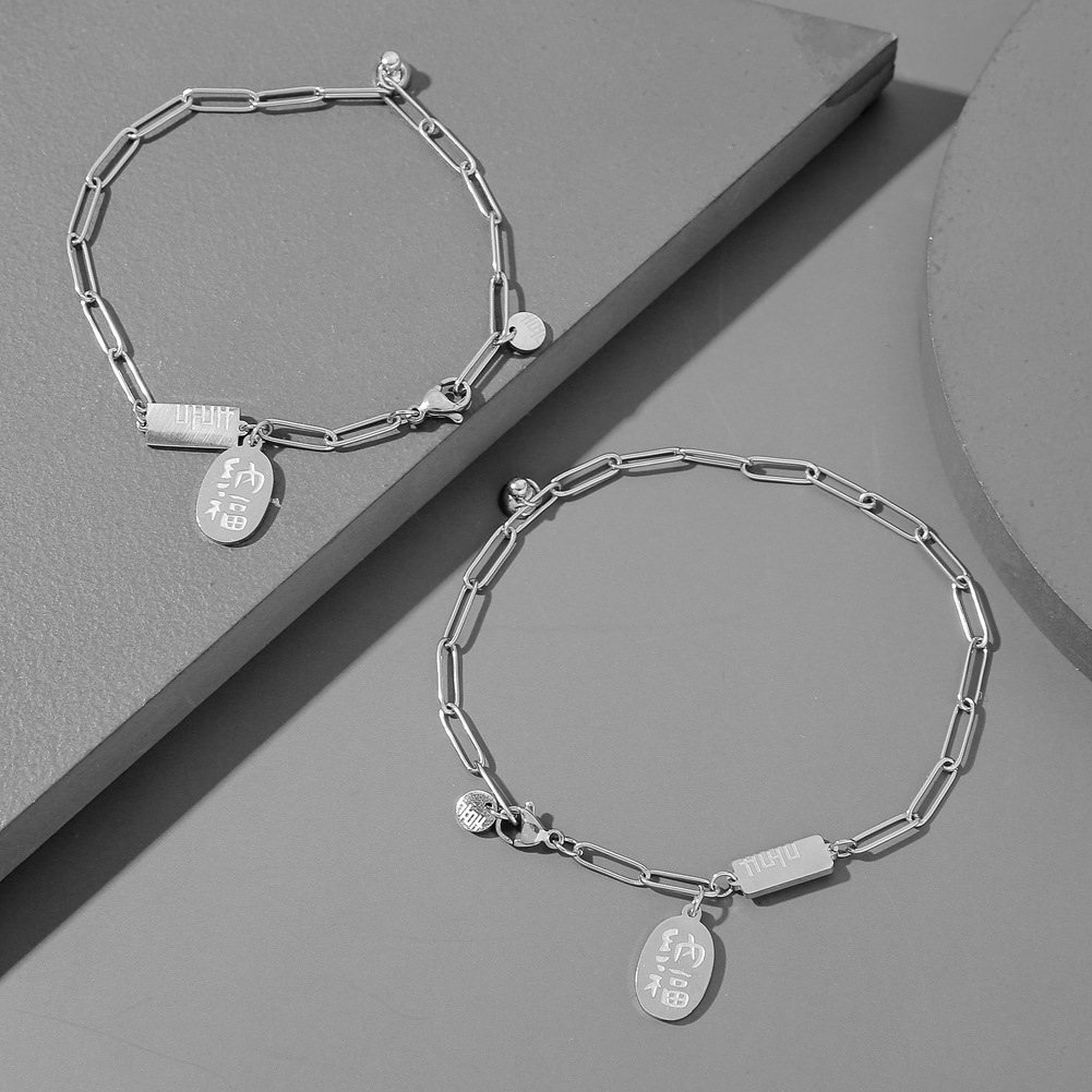 シルバー製の洗練されたチェーンデザインに、招財納福の文字が刻まれた縁起の良い札飾りが揺れる特別な一品。