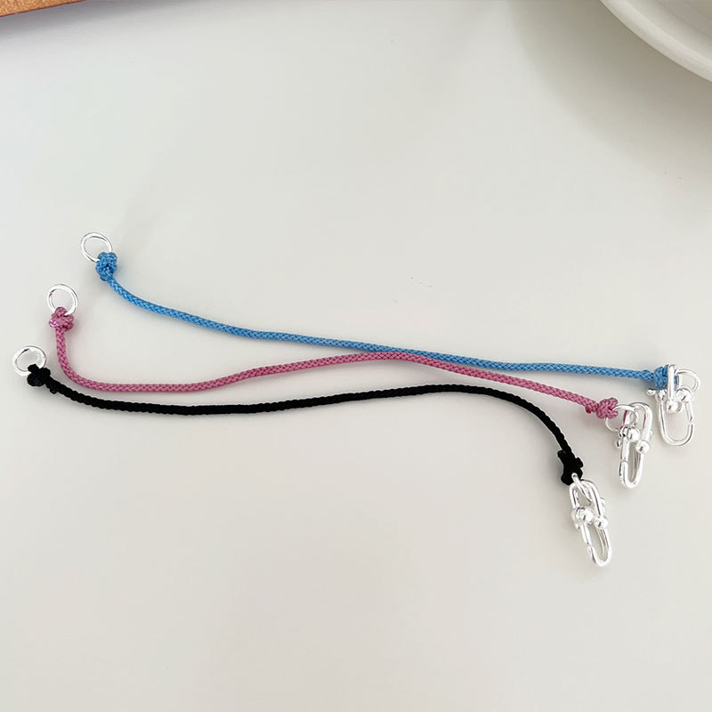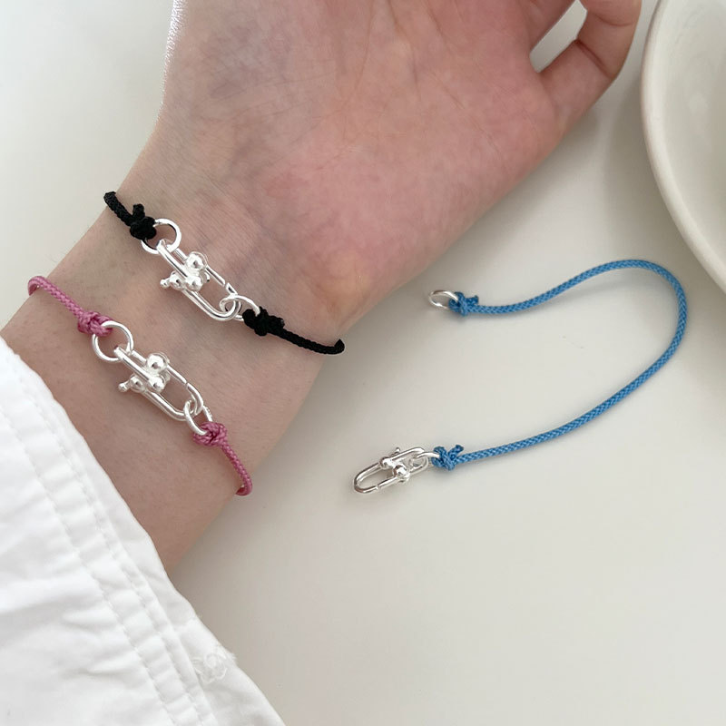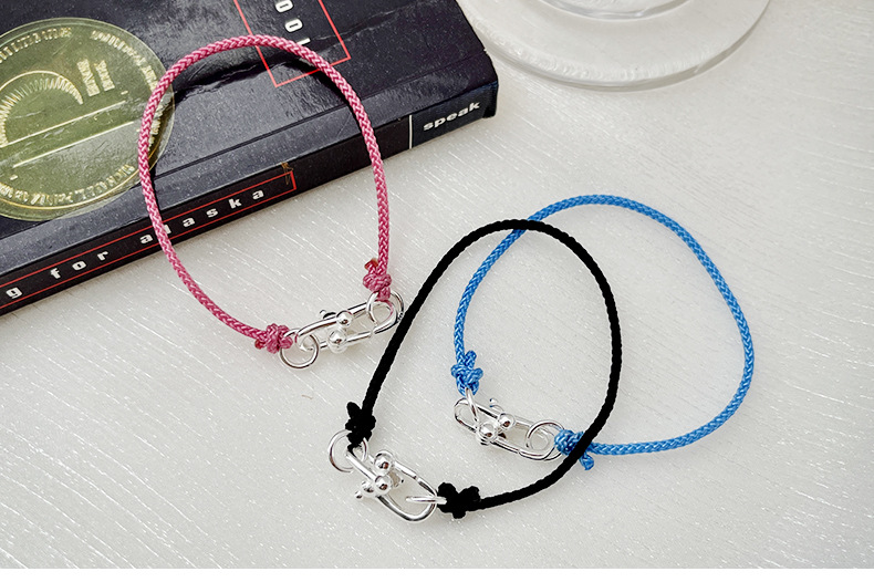 シルバー素材の立体的なU字型留め具が、シンプルな編み紐に洗練されたアクセントを添えます。