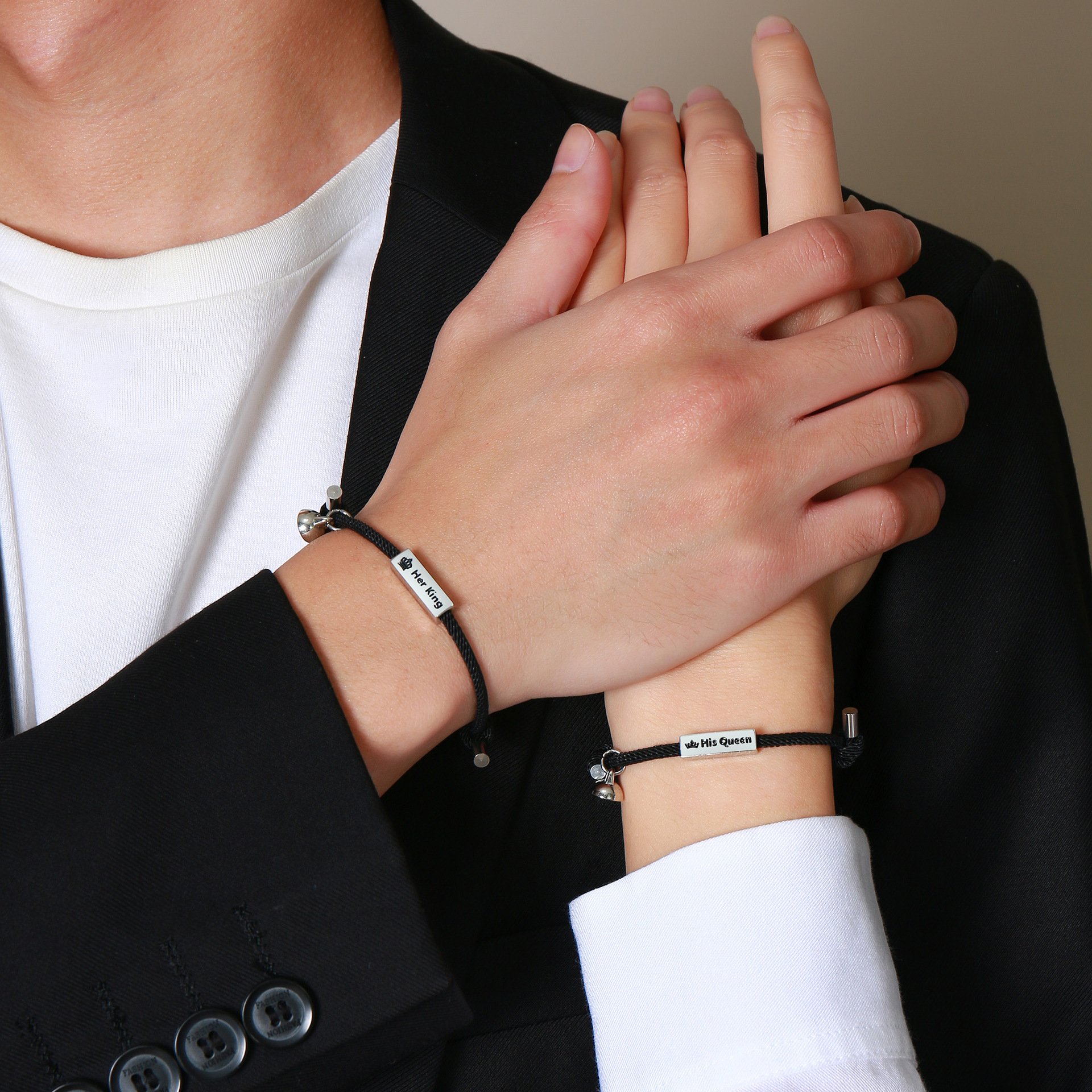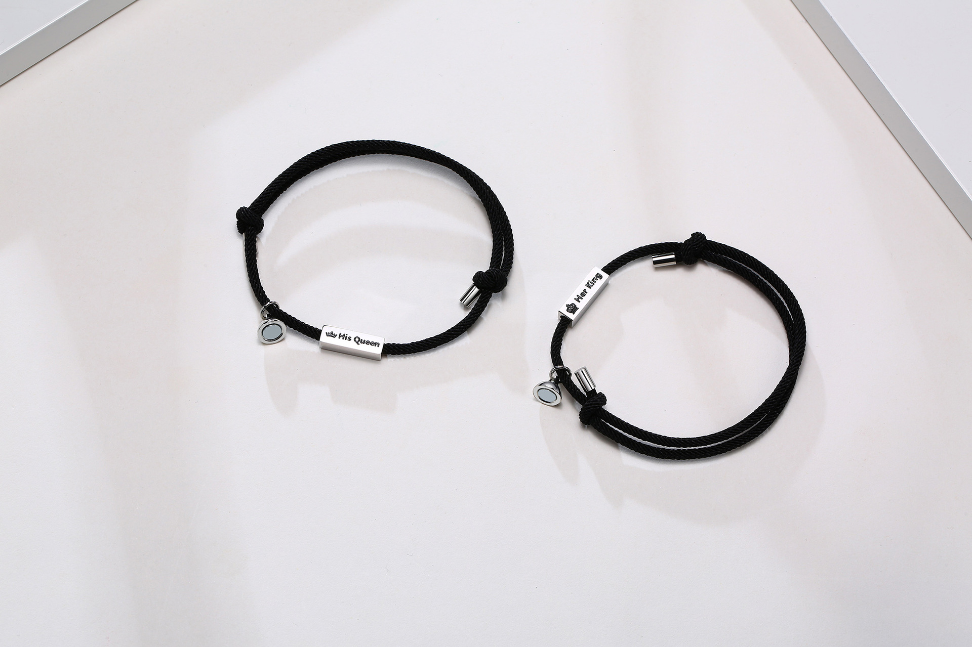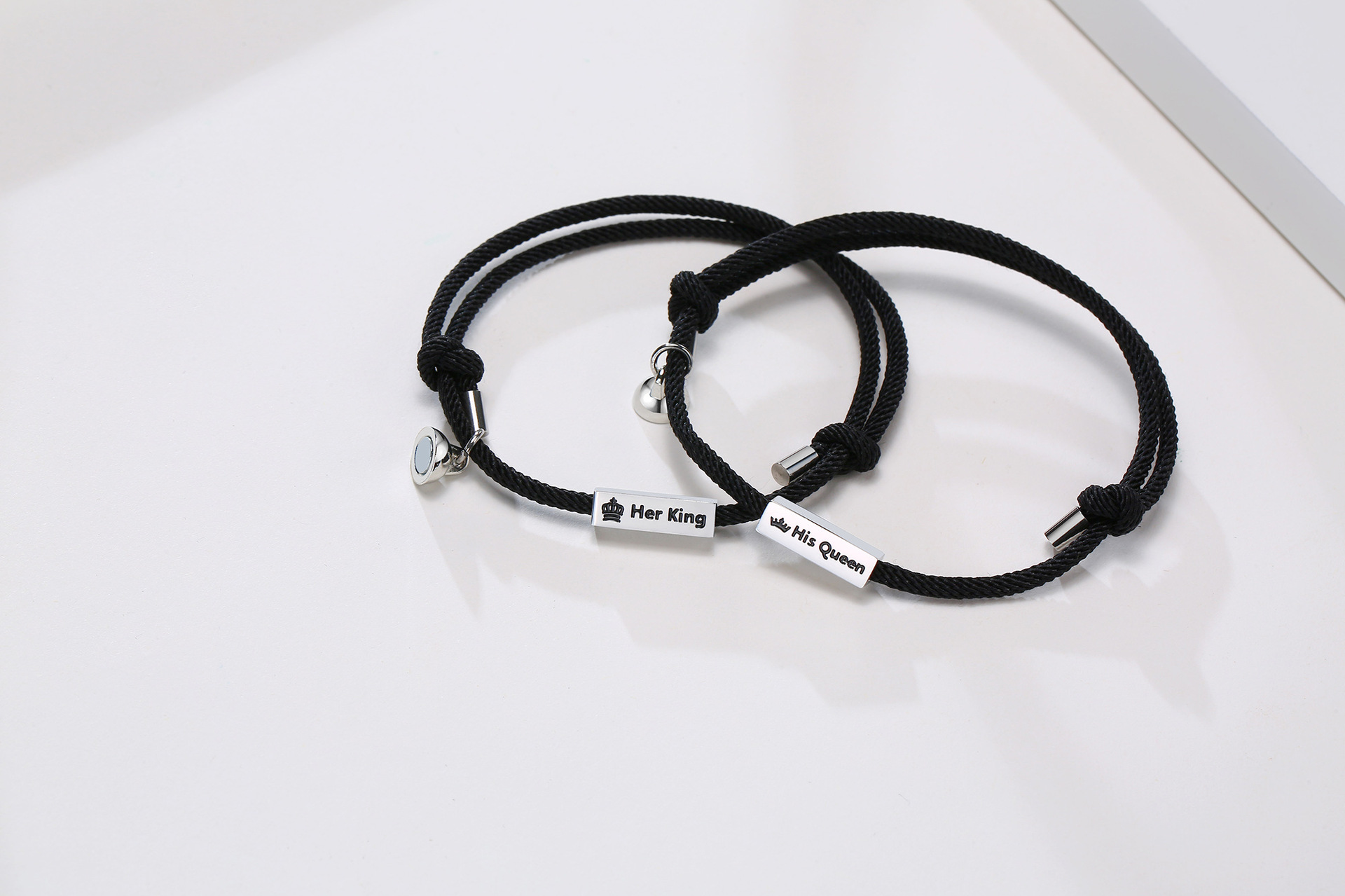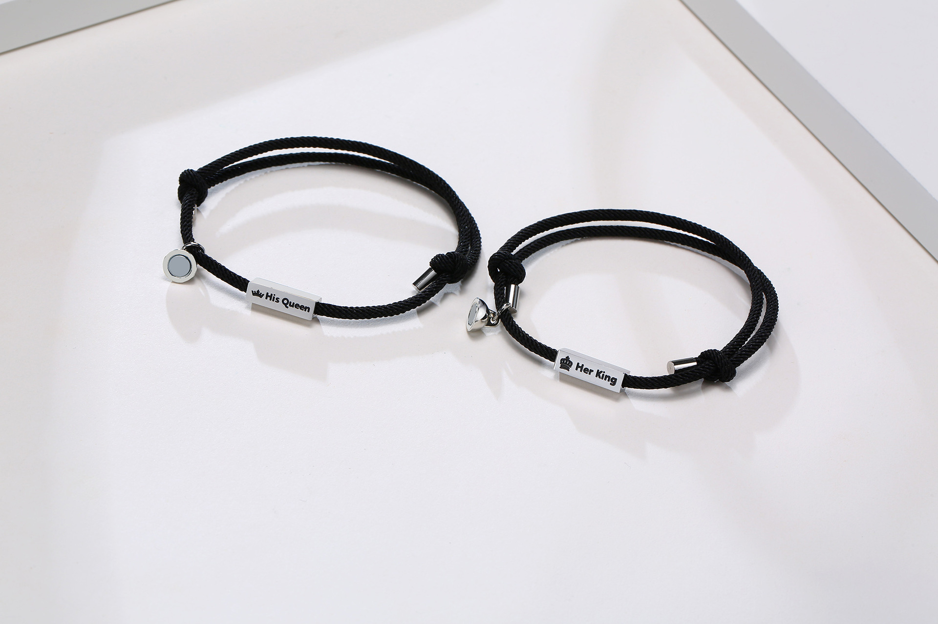 ステンレス製のプレートに王冠と「彼の女王」「彼女の王様」のメッセージが刻印されており、二人の特別な関係を表現しています。