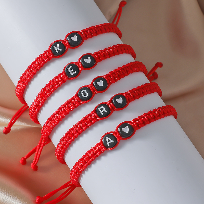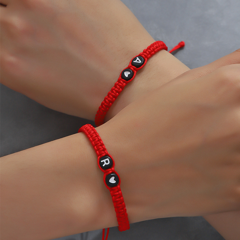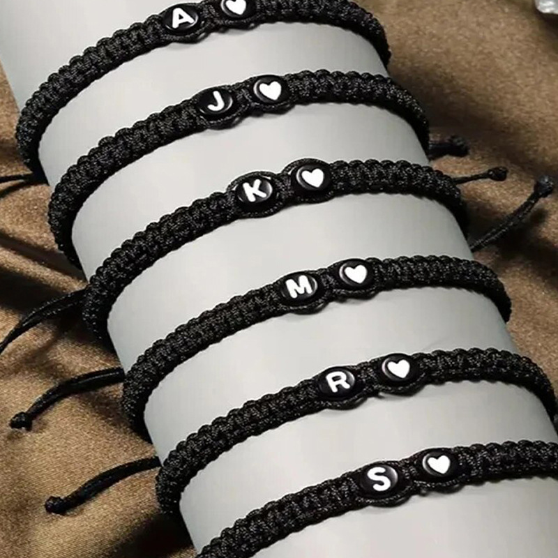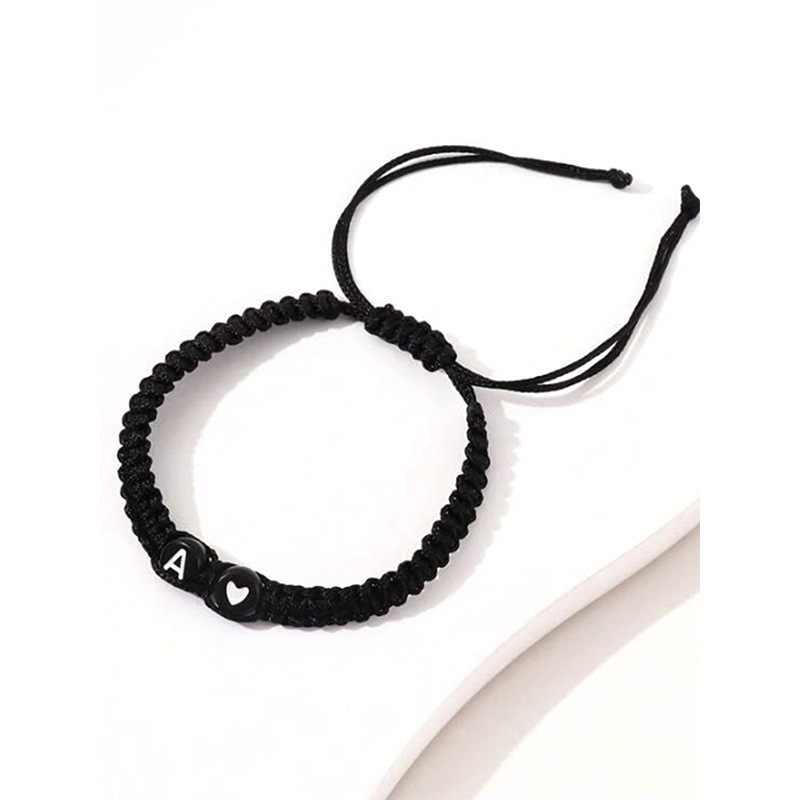 丁寧に編み込まれた紐にシルバーのイニシャルビーズとハートのチャームが施され、二人の絆を優しく表現します。