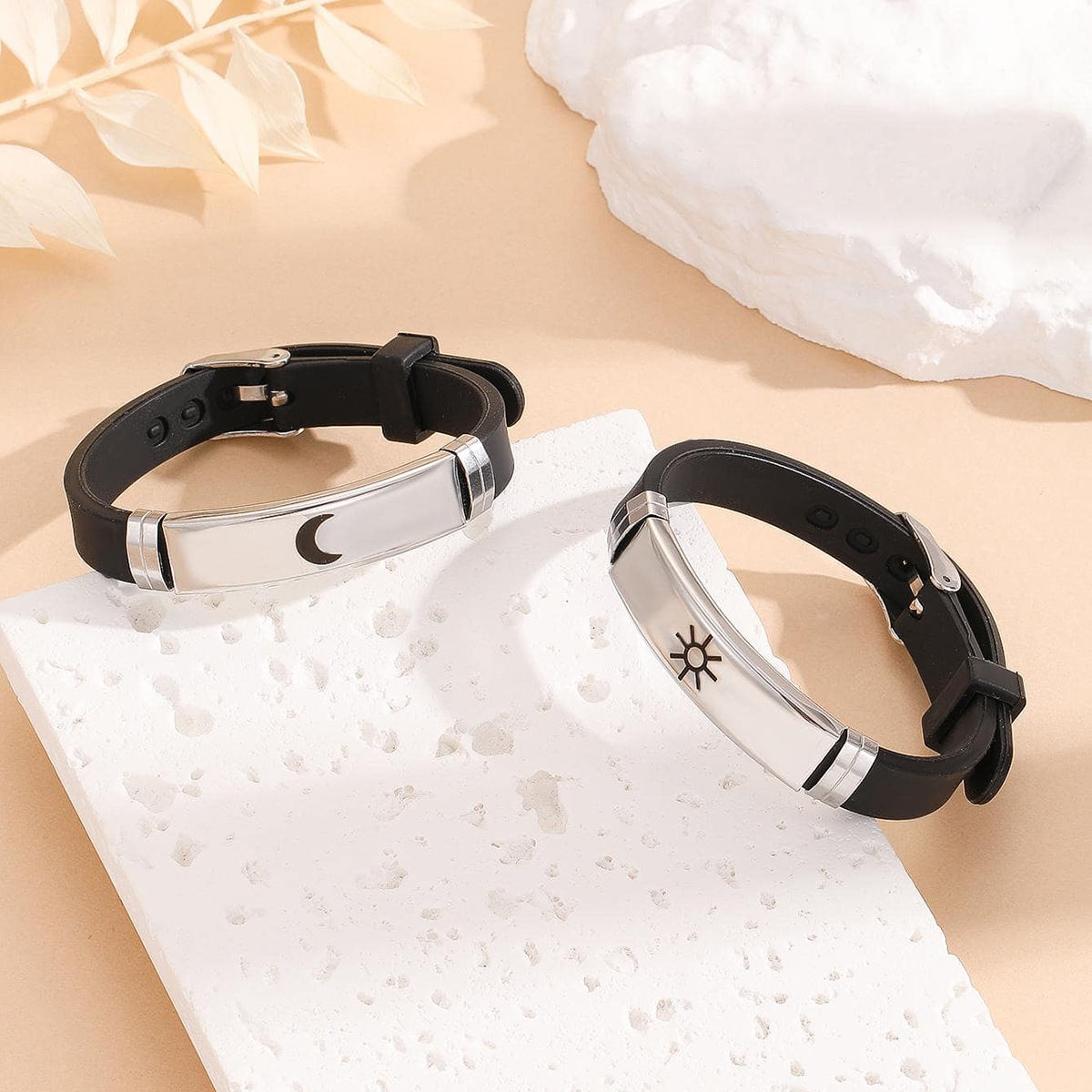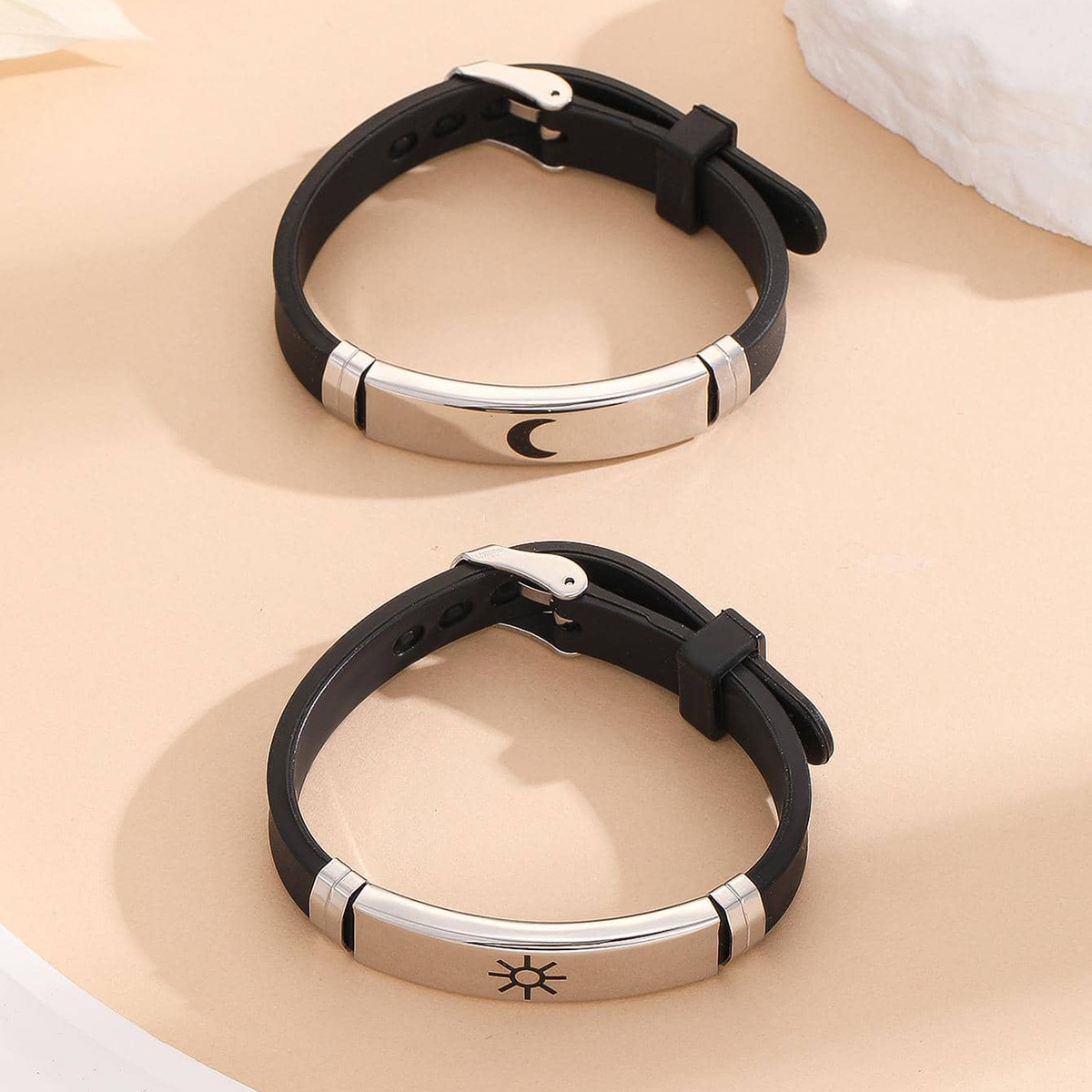 月と太陽の刻印が印象的なペアブレスレットです。