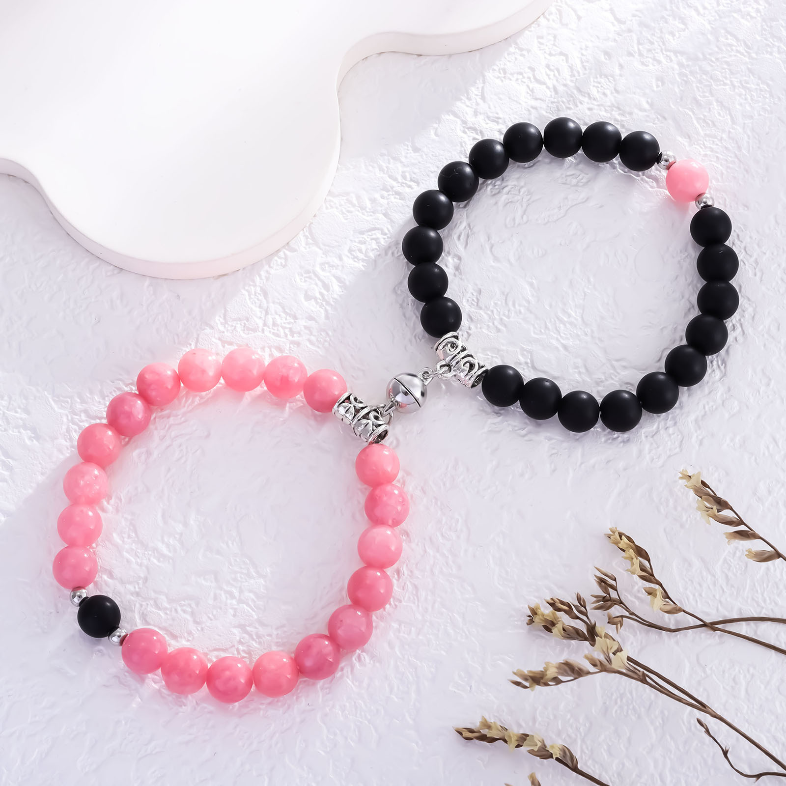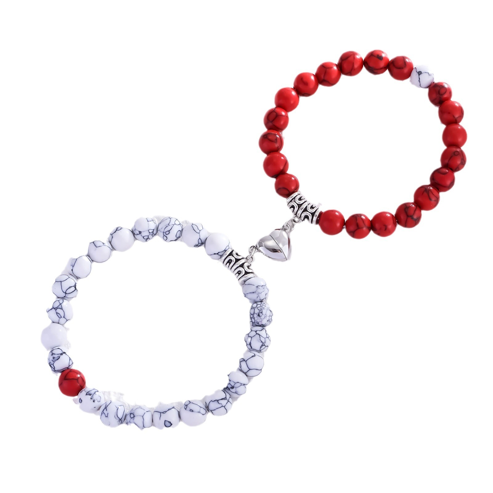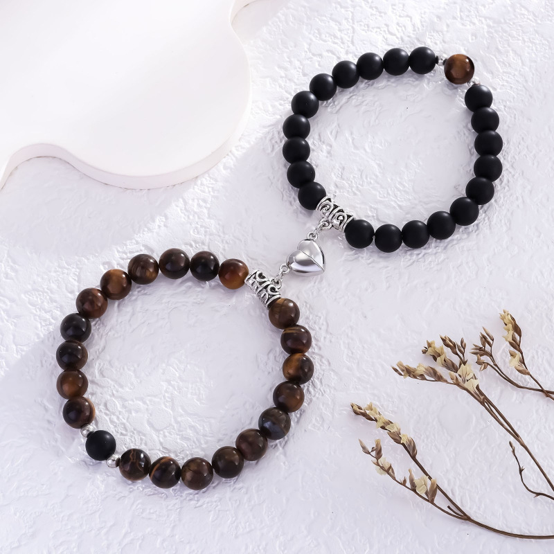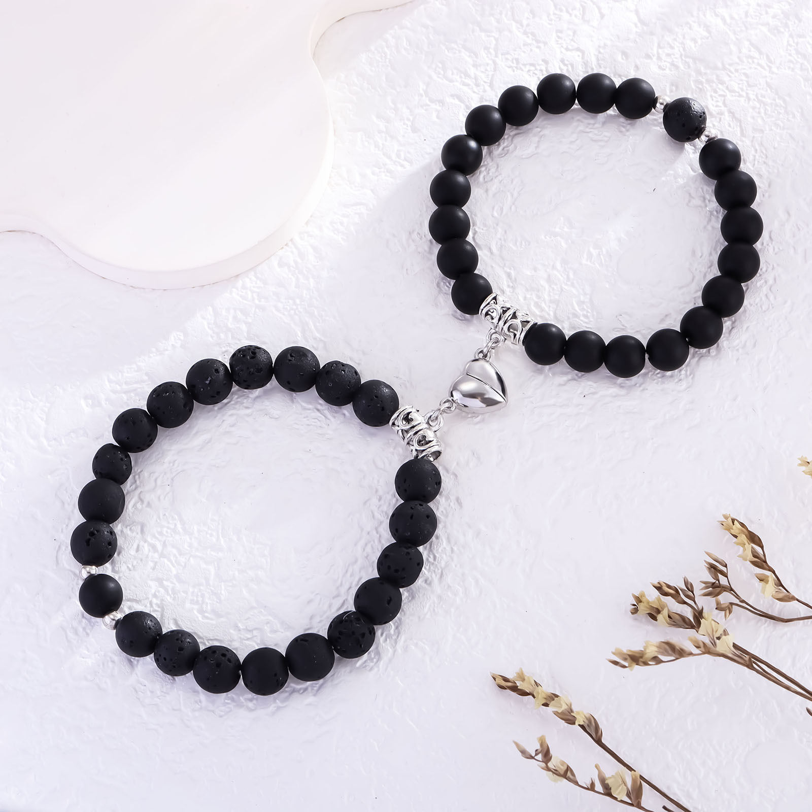 直径8ミリの丸玉を丁寧に連ね、ハート型の飾りが二人の心を繋ぎます。