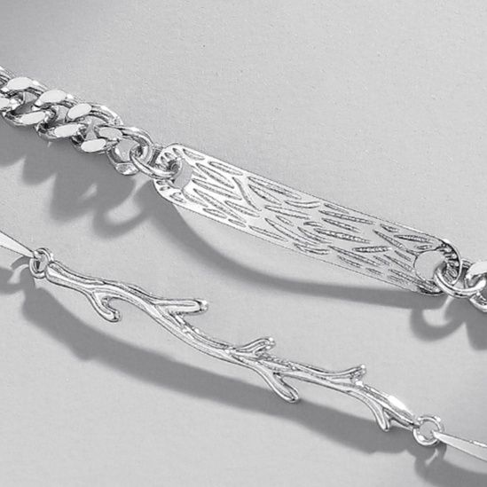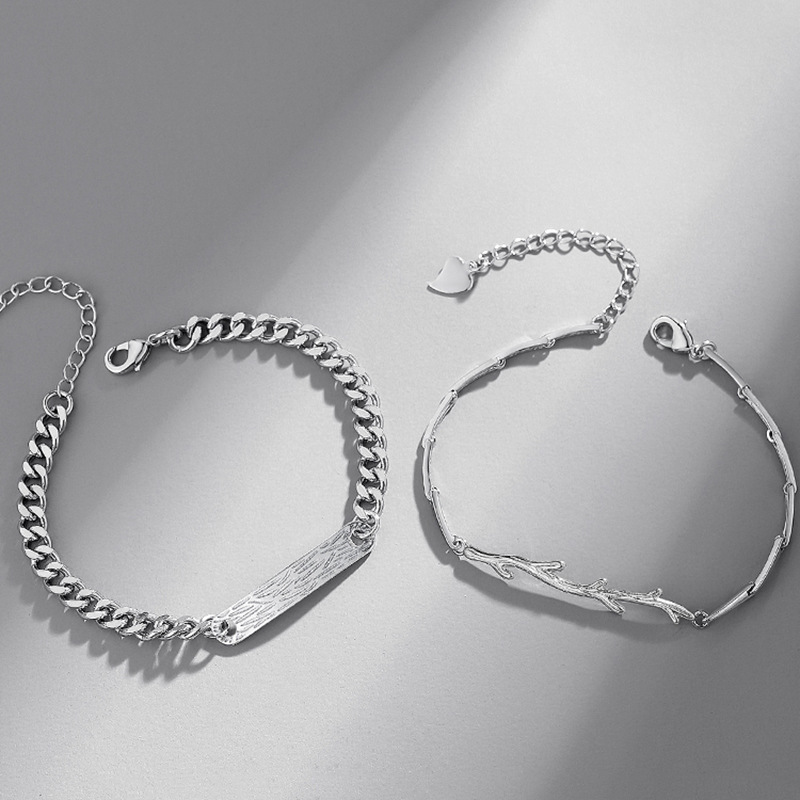 自然の枝をモチーフにした繊細な女性用デザインと、スタイリッシュな喜平チェーンの男性用デザインを組み合わせたペアブレスレットです。