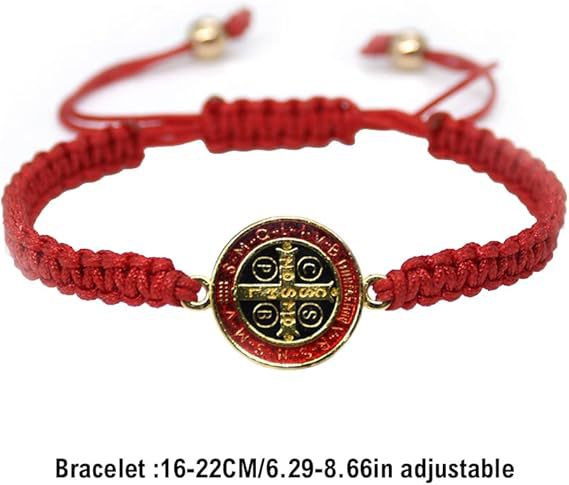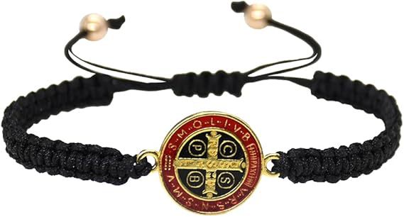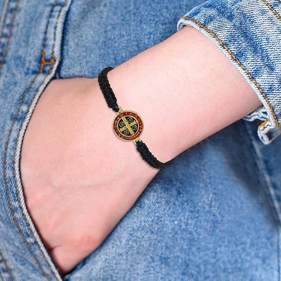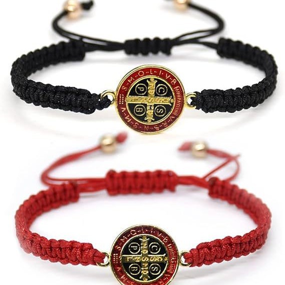 神聖な十字架のメダルが中央に輝く、手編みのペアブレスレットです。