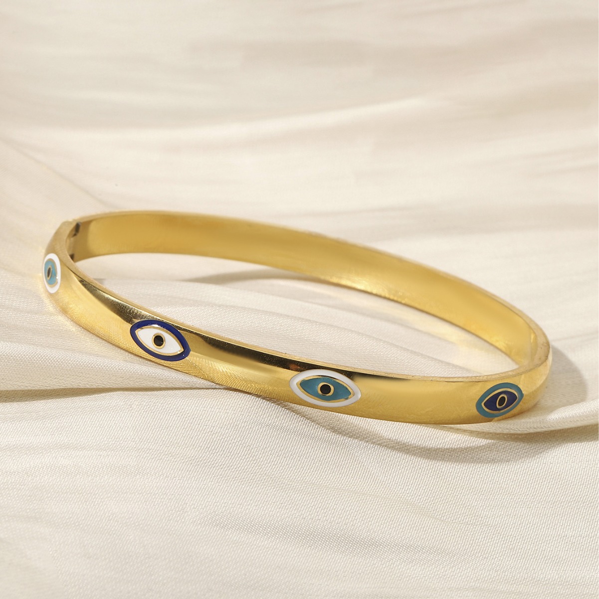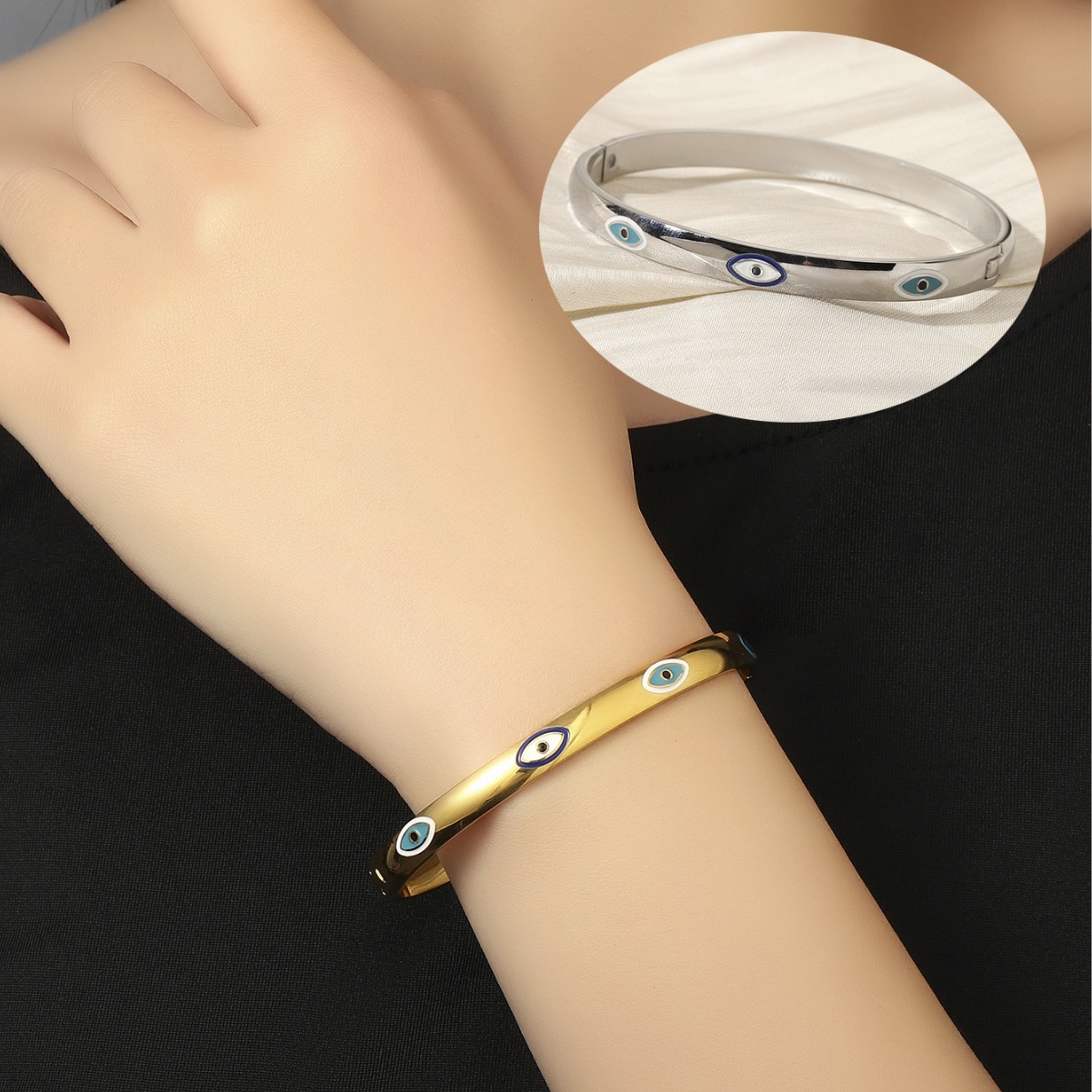 邪眼モチーフがあしらわれた洗練されたデザインのペアブレスレットです。