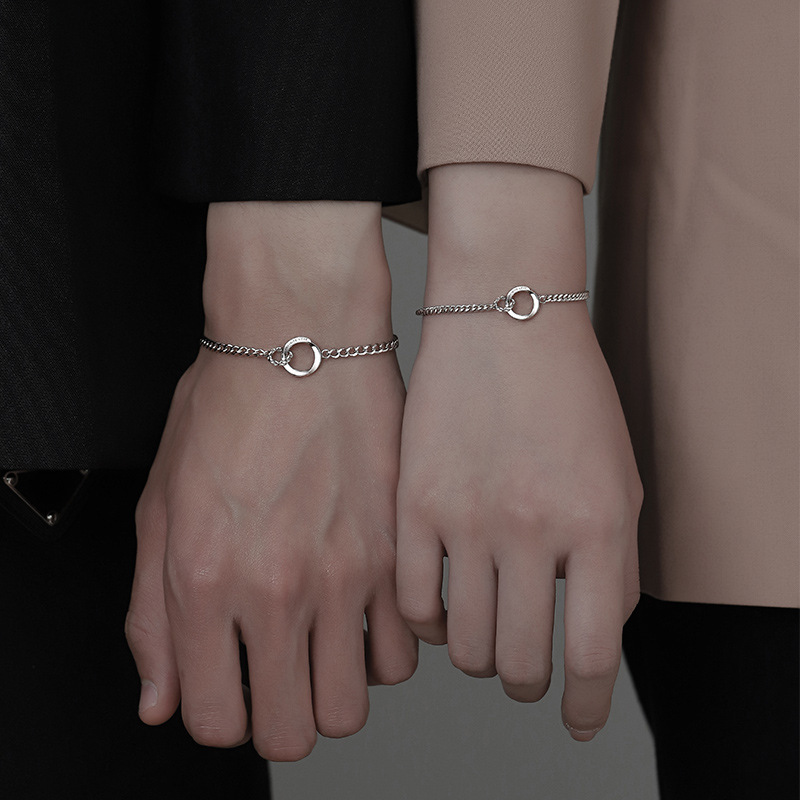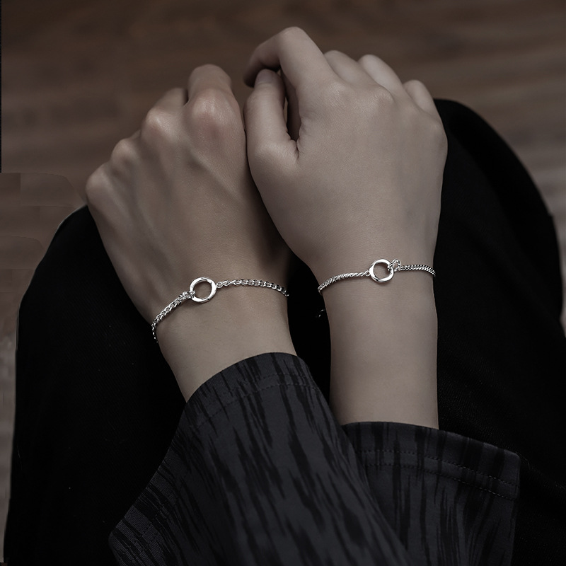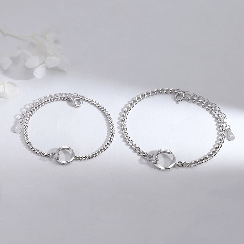 永遠の絆を象徴する二重リングをあしらったシルバーのペアブレスレットです。