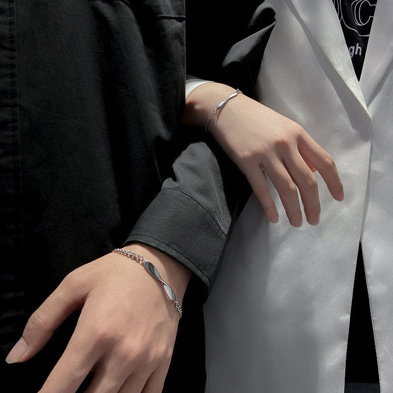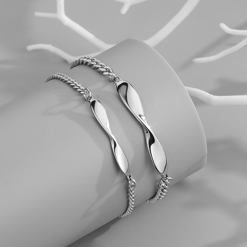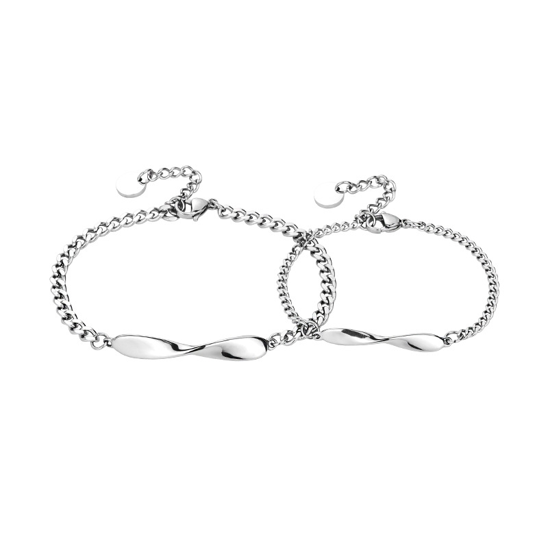 繊細なチェーンに捻りを加えた立体的なモチーフが特徴のペアブレスレットです。