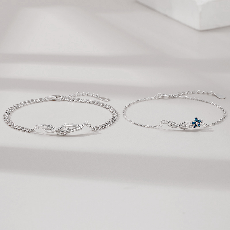 シルバー素材の繊細なチェーンに、互いに手を繋ぐデザインが施されており、二人の変わらぬ愛情を象徴しています。
