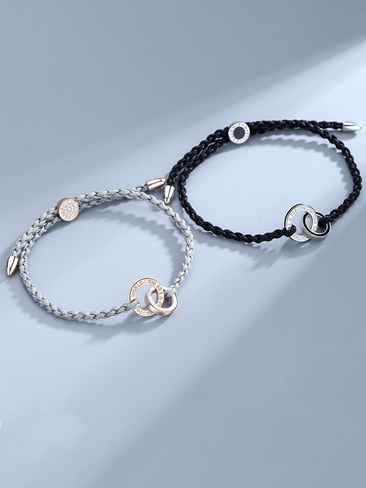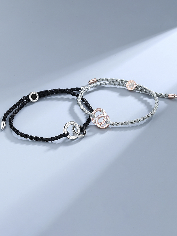シルバー製の繊細な二重リングチャームに刻まれた文字が高級感を演出し、編み込みコードが手首に優しくフィットします。