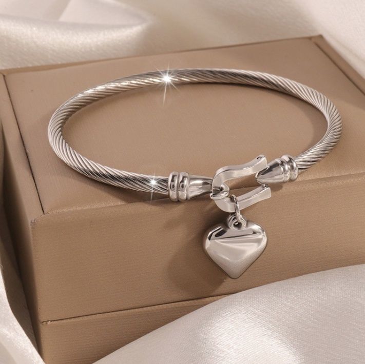 繊細な螺旋模様が施されたバングルに、ぷっくりとした立体的なハートモチーフが添えられています。