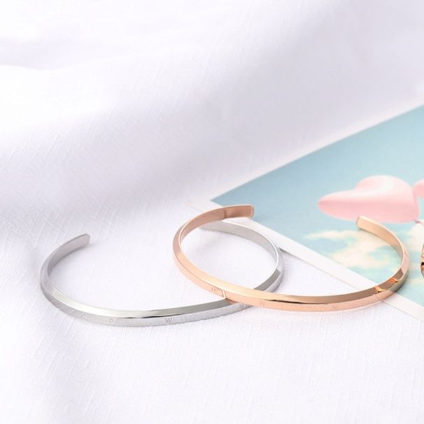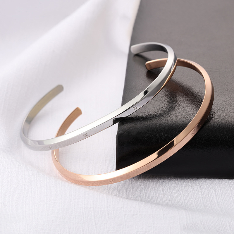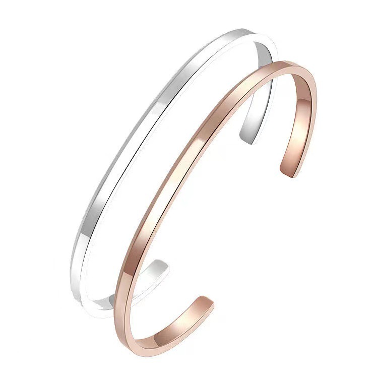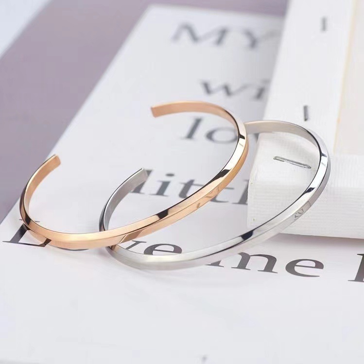 ステンレス素材を使用した開口型のバングルデザインで、手首に優しくフィットします。